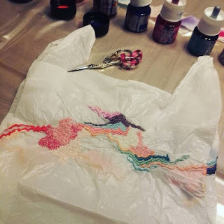 Du tissu, des encres de plusieurs couleurs, différents fils ...